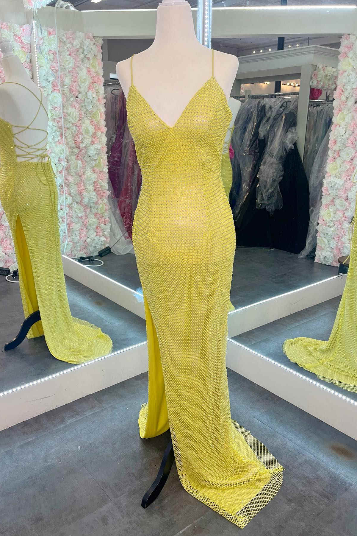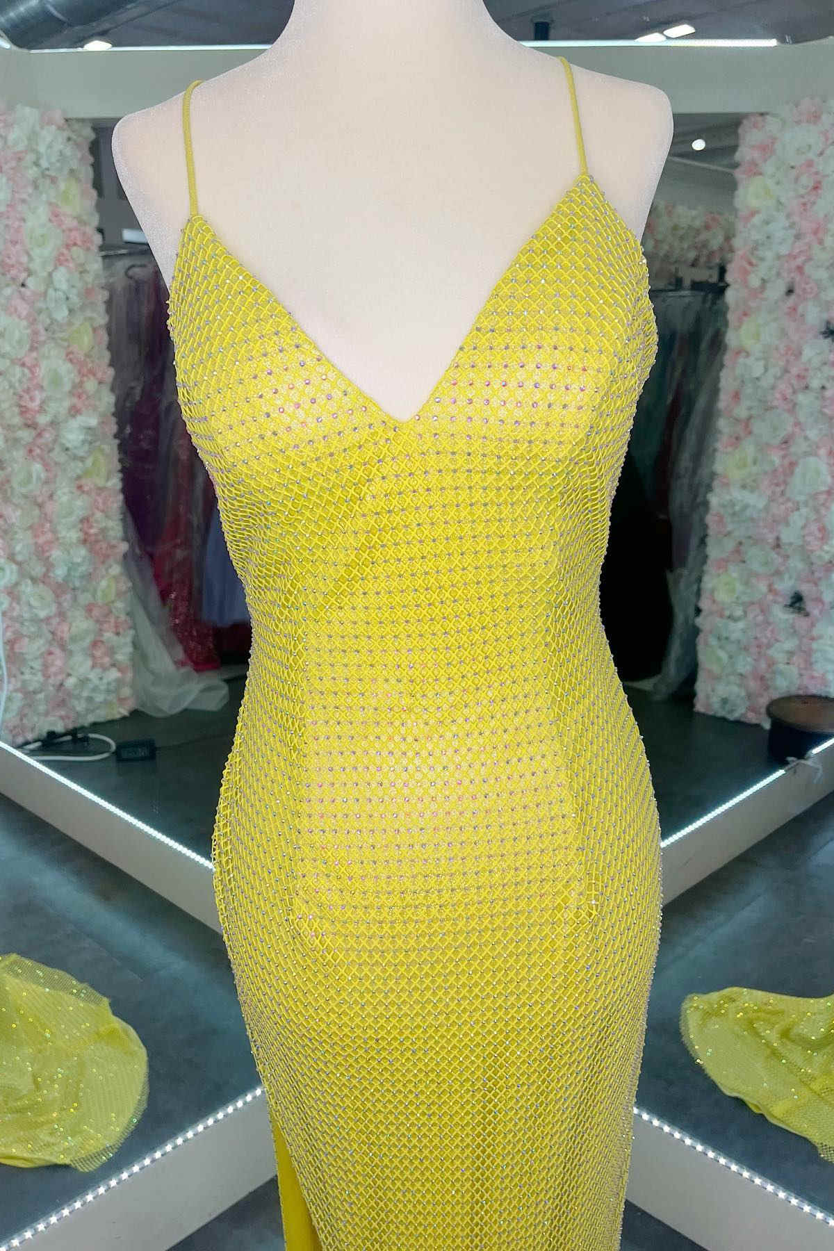This mermaid yellow long prom dress features a v-neck with straps, a fitted bodice with rhinestones grid, and a lace-up back.