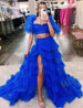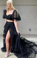This Two Piece Lavender Off the Shoulder Ruffles Prom Dress with Slit offers a timeless look. It features an off-the-shoulder neckline, puff sleeves, and an A-line skirt with ruffle details, finished with a side slit. Perfect for an unforgettable look.