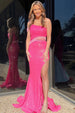 This two piece long prom dress features a one shoulder neckline, a fitted sequin bodice with fringes and a mermaid skirt with side slit.
