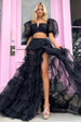 This timeless two-piece black prom dress features a square neckline, balloon sleeves, a cascading ruffle-tiered skirt, and a sexy thigh-high slit. Create a classic look and showcase your curves with this sophisticated ensemble.