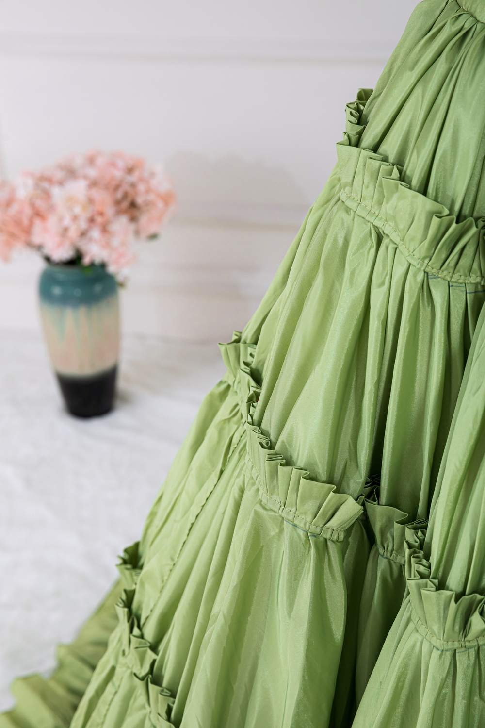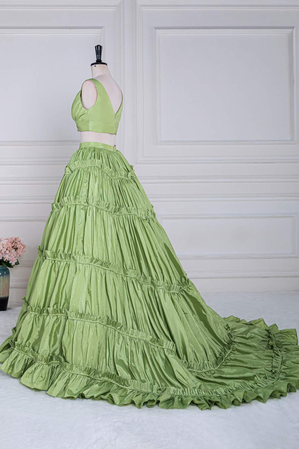 This elegant two-piece ball gown is perfect for formal occasions. Crafted from a green taffeta, it features a v-neck bodice and an A-line skirt with ruffle details that complete the look. A sweep train adds an extra touch of glamour.