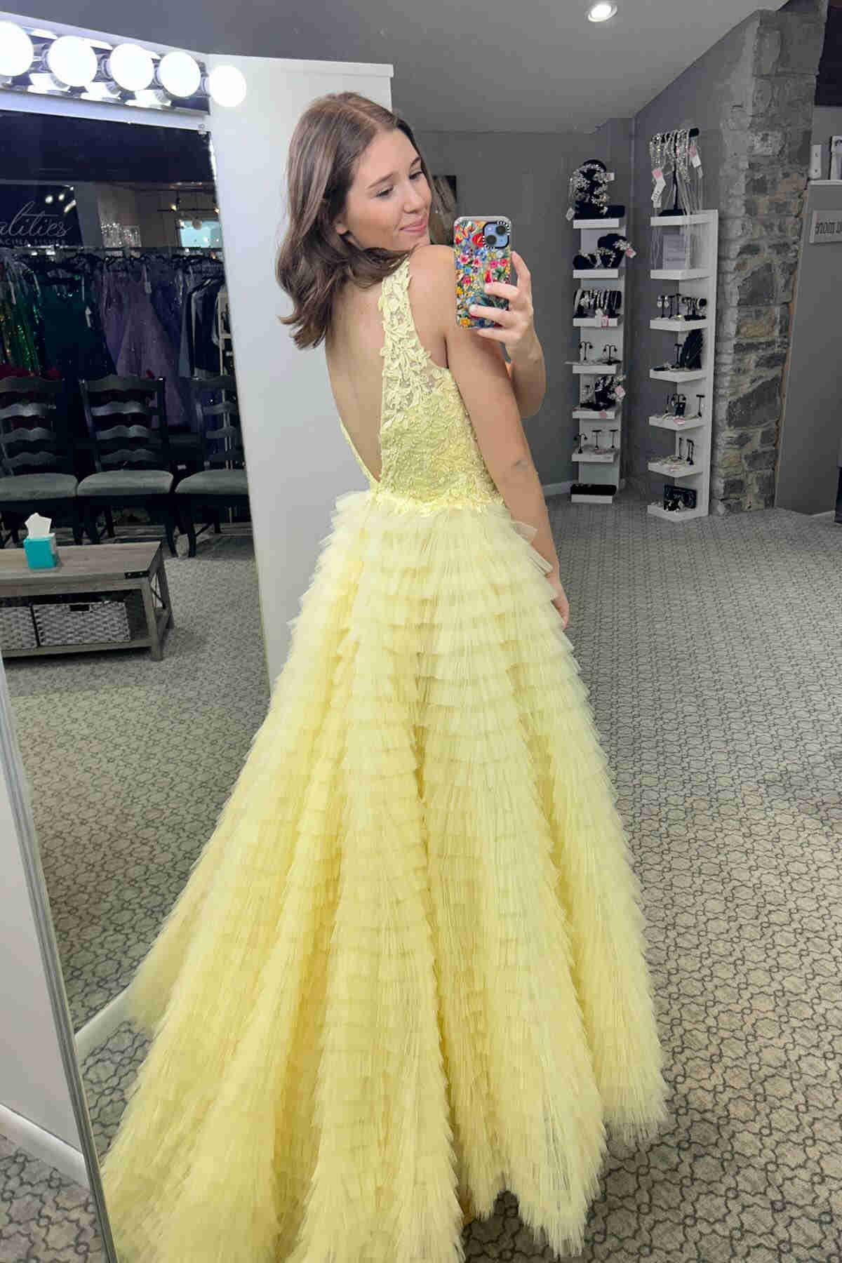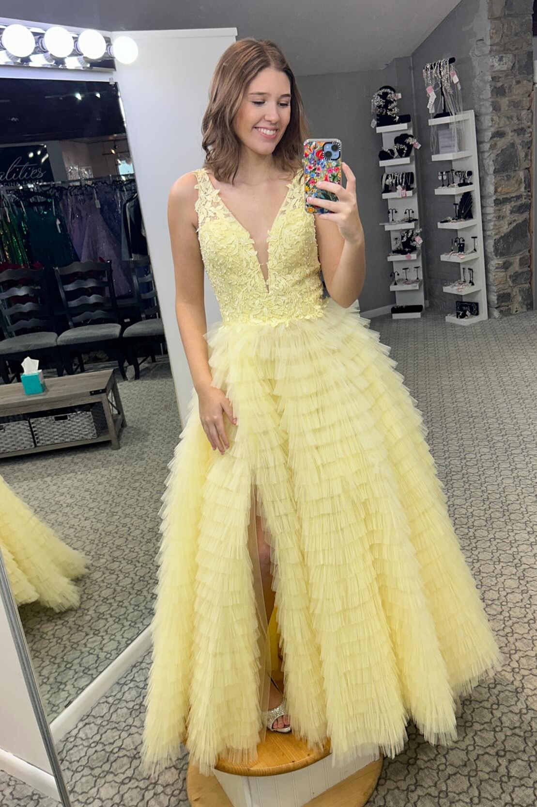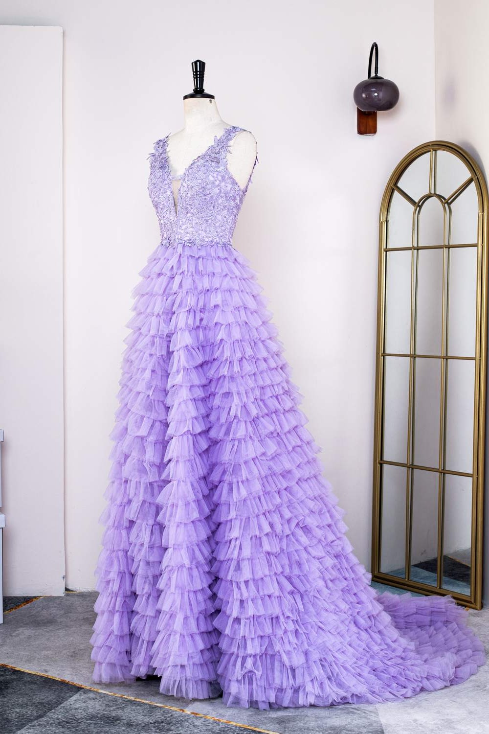 Featuring a modern V-neck with insert mesh, an applique emblished top, and a tiered A-line skirt with a side slit, this elegant lavender prom dress will have you looking your best. The zipper back ensures a perfect fit.