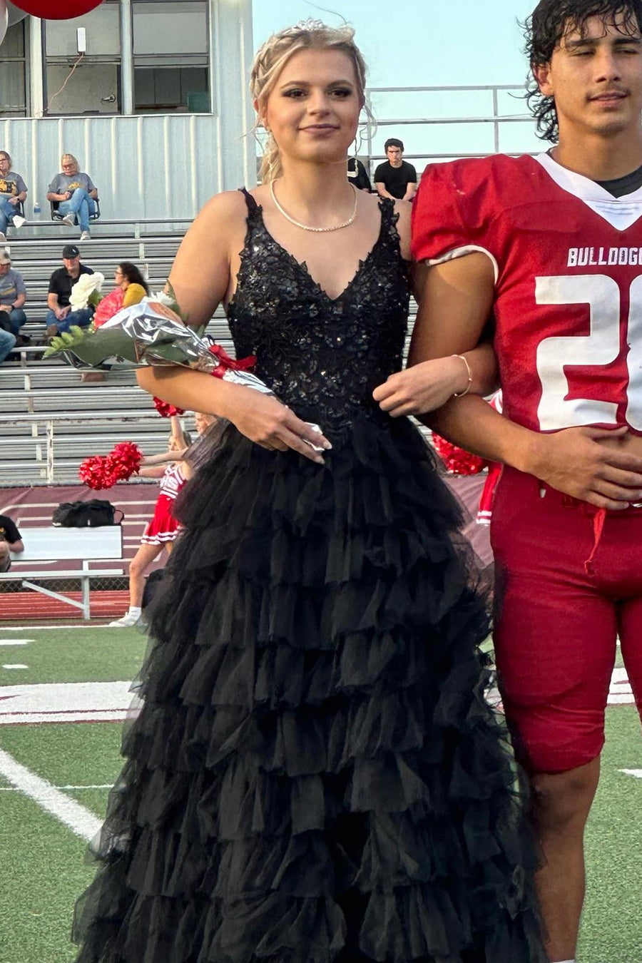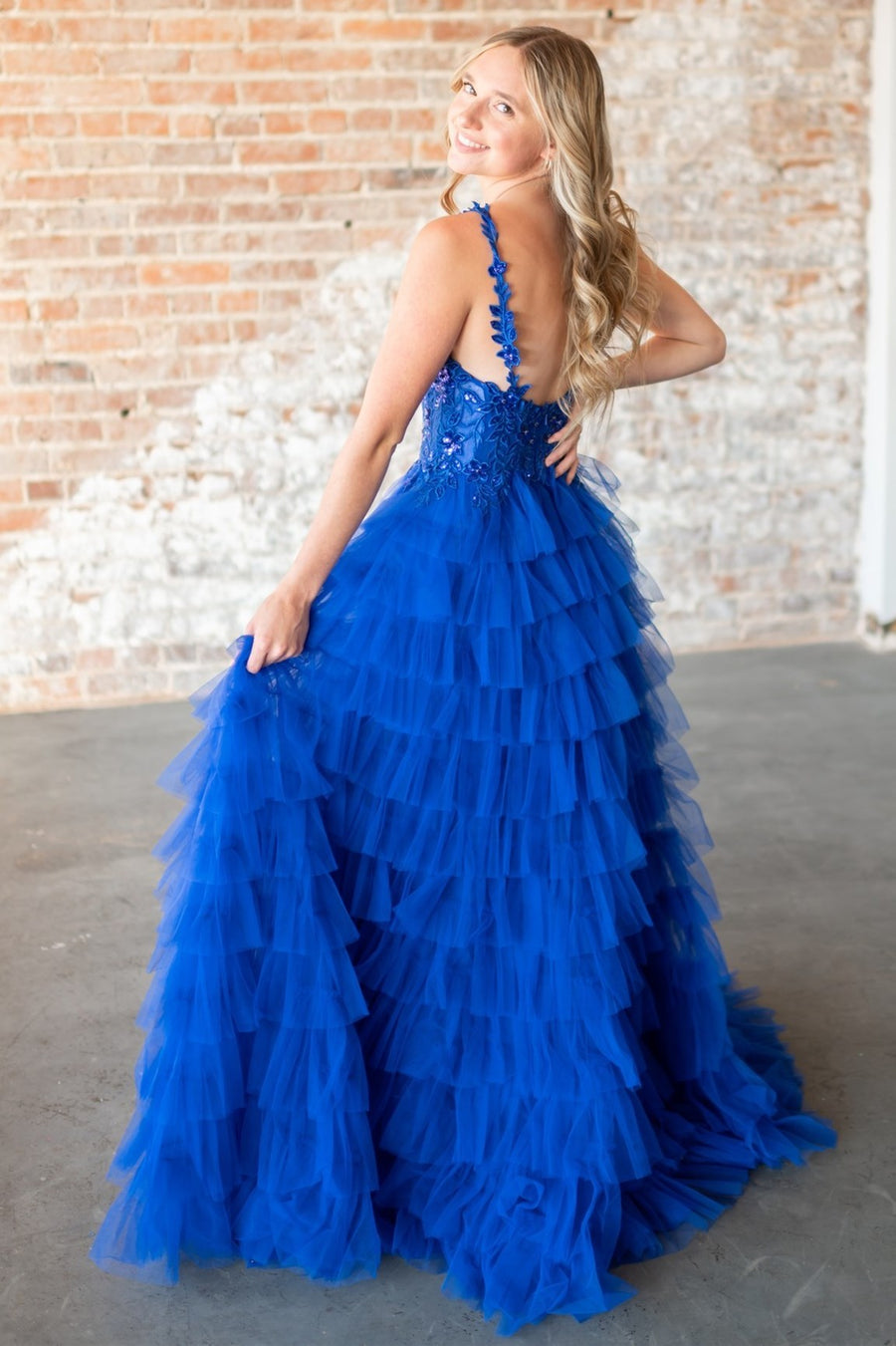 This V-Neck Magenta Lace Appliques Layered Tulle Prom Dress features a stunning v-neckline, delicate lace appliques, and a ruffle-tiered skirt for a romantic look. Perfect for a special occasion or formal event, you'll be sure to turn heads.