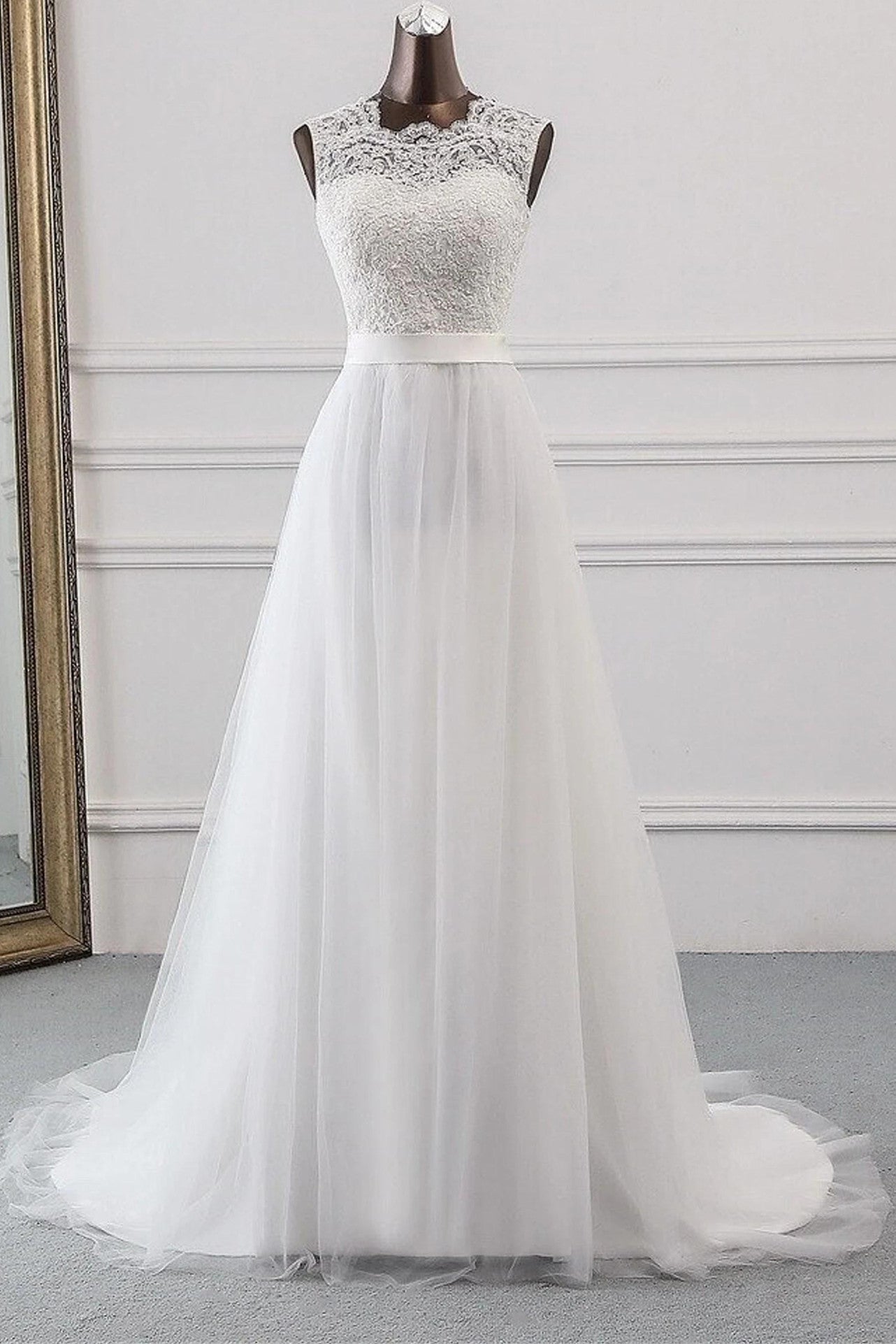 Modsele white wedding dress features lacy neckline, princess seemed bodice, banded waist, lace-up on the back and long A-line sweep train.