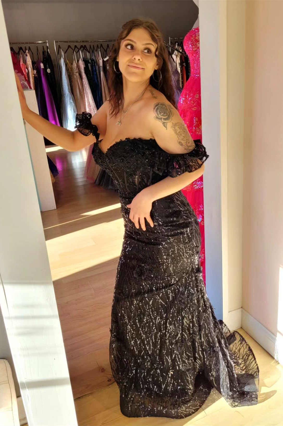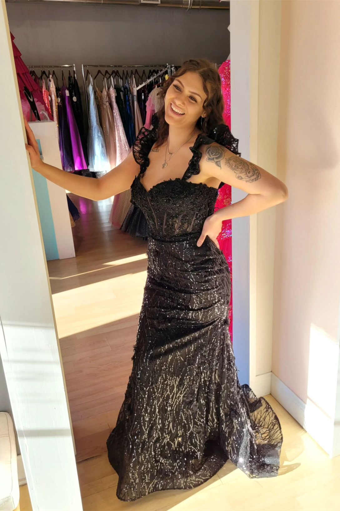 This elegant yellow gown offers a blend of sophistication and style. The straps feature ruffle details, while the lace corset bodice gives this dress an elegant look. The mermaid skirt is complete with sequin and flower details, adding to the unique flair of this dress. This gorgeous dress is perfect for making a statement at your special occasion.